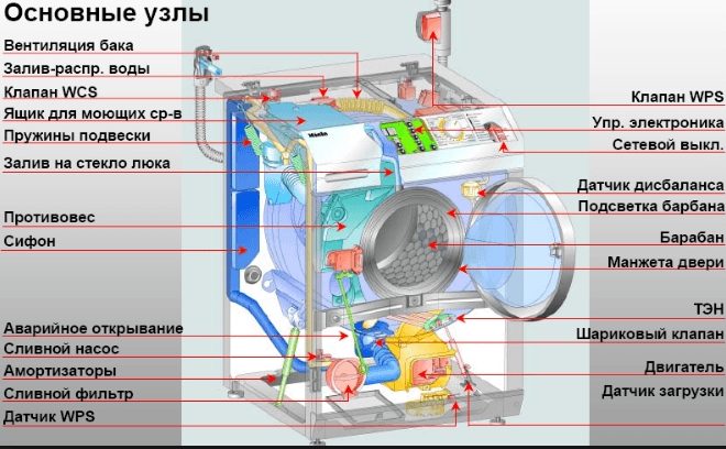 Важно учитывать и условия эксплуатации. Как видно, самая большая потребляемая мощность – электродвигателя стиральной машины и ее нагревательного элемента. Но в совокупности расход электроэнергии зависит от выбранной программы, режимов стирки, загрузки барабана, а также от состояния комплектующих деталей.